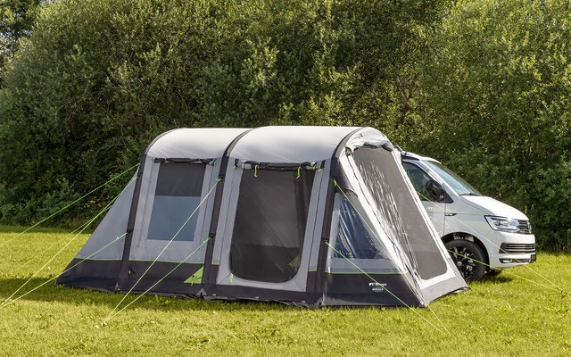 Freistehendes und aufblasbares Busvorzelt für Fahrzeuge mit Regenrinnenhöhe von 180 – 220 cm. Die Gesamthöhe beträgt 240 cm.