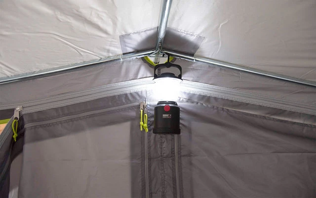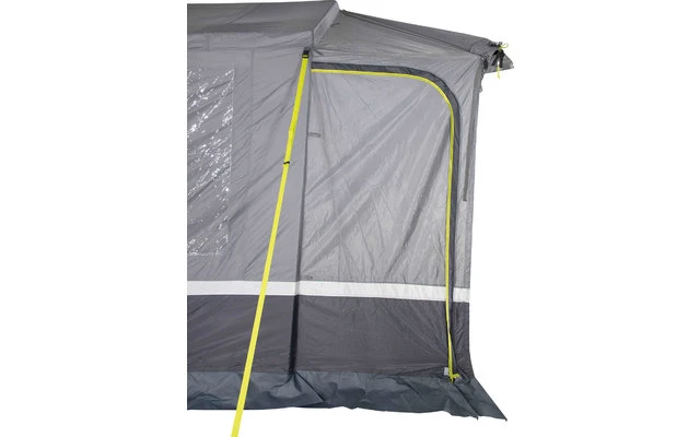 4 neongelbe, verstellbare Sturmbänder und Abspannleinen sind in der Dämmerung gut sichtbar. Die Schleuse hat eine Dach-Befestigungslänge von 245 cm und eine verstellbare Anbauhöhe von 180-240 cm mittels Reißverschlusses und verstellbarem Gurtband. 2 Schleusentüren ermöglichen den Zugang zum Fahrzeug. Das praktische „Drive Away Zip System“ ermöglicht ein leichtes Fahrzeug An- und Abdocken. Das Zelt ist mit einer Keder-Reißverschlussleiste ausgerüstet. Keder in die Kederschiene am Fahrzeug einziehen und mittels Reißverschluss verbinden. Die Schleuse ist komplett aufrollbar. Flexible Befestigung am Fahrzeug. 1- Hohlsaum Schleusenstab mit Klemmen oder Abspannleinen.